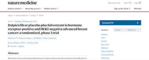 11月4日,国际四大医学期刊之一、英国《自然》旗下《自然医学》(Nature Medicine)在线发表CDK4/6抑制剂达尔西利(SHR6390)联合氟维司群治疗既往内分泌治疗后疾病进展的HR+/HER2-晚期乳腺癌的多中心、随机、双盲III期临床研究(DAWNA-1研究)中期分析结果报告,首次对氟维司群(雌激素受体降解剂)±达尔西利治疗激素受体阳性晚期乳腺癌的有效性和安全性进行了比较。研究结果显示,达尔西利+氟维司群组与安慰剂+氟维司群组相比,无进展生存期(PFS)显著延长。该项研究由中国医学科学院肿瘤医院徐兵河教授担任leading PI,全国39家医院参研,由AG旗舰厅医药临床研发团队支持完成。