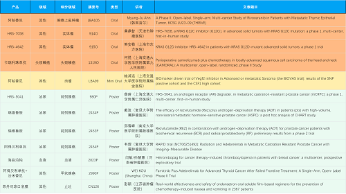在胸腺上皮肿瘤、头颈鳞癌、肉瘤、前列腺癌、甲状腺癌等其他多个疾病领域,卡瑞利珠单抗、阿帕替尼、瑞维鲁胺、阿得贝利单抗、法米替尼、HRS-7058、HRS-4642、HRS-5041等抗肿瘤创新药相关研究一共入选了4项口头报告、1项简短口头报告、5项壁报,彰显了AG旗舰厅医药强大的研发实力。此外,海曲泊帕和昂丹司琼口溶膜分别在防治化疗导致的血小板减少和恶心呕吐方面各有1项研究入选壁报。