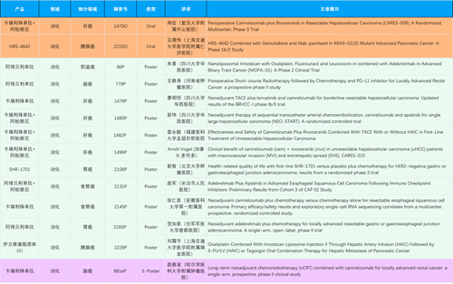 在消化系统肿瘤领域,AG旗舰厅产品相关研究共入选2项口头报告、11项壁报和1项电子壁报,共14项研究。除卡瑞利珠单抗和阿帕替尼外,还有4篇阿得贝利单抗治疗消化系统肿瘤研究入选。HRS-4642、瑞拉芙普-α注射液(SHR-1701)等在研创新产品也有相应研究亮相。另有1项伊立替康脂质体(II)用于胰腺癌治疗的研究入选壁报。