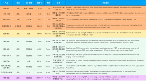 在胸腺上皮肿瘤、头颈鳞癌、肉瘤、前列腺癌、甲状腺癌等其他多个疾病领域,卡瑞利珠单抗、阿帕替尼、瑞维鲁胺、阿得贝利单抗、法米替尼、HRS-7058、HRS-4642等抗肿瘤创新药相关研究一共入选了4项口头报告、1项简短口头报告、4项壁报、1项电子壁报,彰显了AG旗舰厅医药强大的研发实力。此外,海曲泊帕和昂丹司琼口溶膜分别在防治化疗导致的血小板减少和恶心呕吐方面各有1项研究入选壁报。